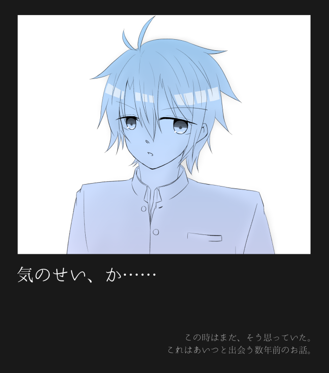 色塗りはどうしようかなと思いつつも最初は色分けしていたんですが、まだこのソフトに慣れていないのでどうやって塗っていたかな…と記憶があやふやになっていたので濃淡だけつけたつもりでした。ただその濃淡もグラデをかけたら殆ど見えなくなったので初めから単色を置くだけでよかったのでは…?と思いましたが深く考えないことにしておきます。あといつも通り細かいことは気にしないでおいていただけたらと思います。添えてある文章についてもそんなに深い意味はないですが、一応補足をするなら約束の先輩の中学生ぐらいの頃のつもりの落書きでした。